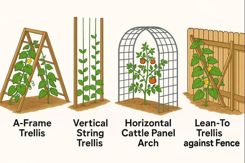 Different trellis styles suit different crops and garden spaces
